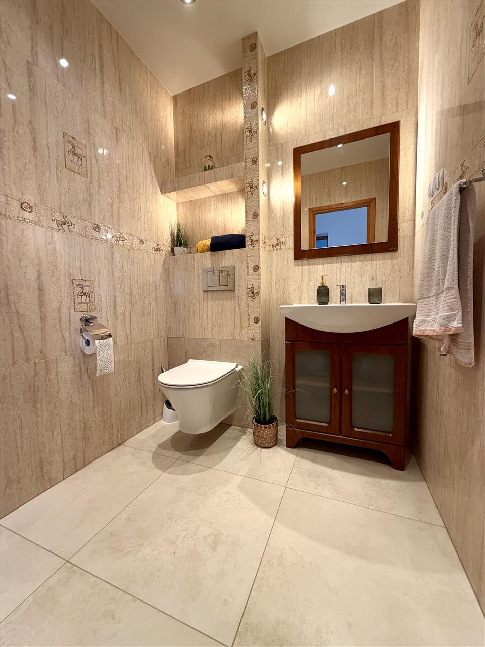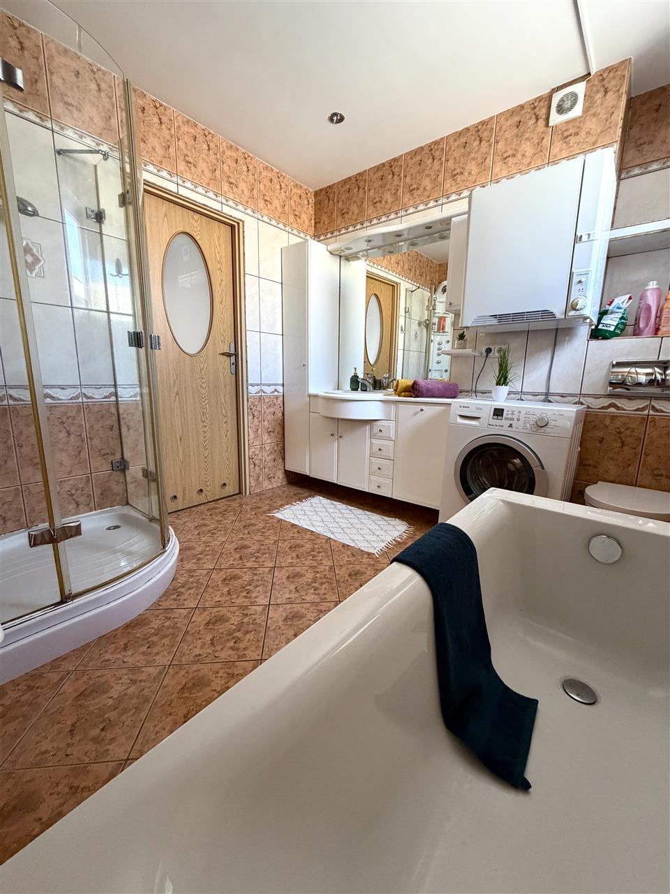 duża łazienka wyposażona zarówno w wannę jak i kabinę prysznicową