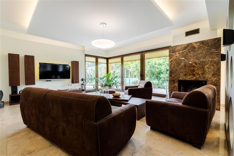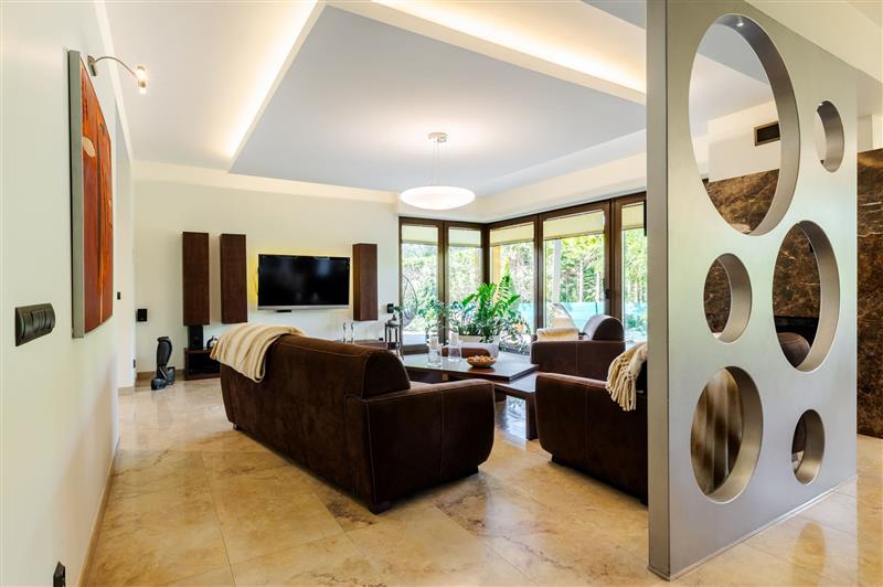 9. Elektryczna i RTV – tablica główna elektryczna w garażu z zabezpieczeniem przeciwporażeniowym i szafką pomiarową usytuowaną w ogrodzeniu, wszystkie kable i przewody miedziane z osprzętem Legrand, wyposażona w gniazda zewnętrzne przy garażu, rondzie, tarasie i na ogrodzie oraz oświetlenie w podbitce z włącznikiem zmierzchowym, szafka RTV ze wzmacniaczami w pralnio – suszarni i rozprowadzeniem do wszystkich pokoi.