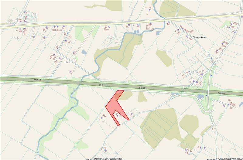 - Stan prawny: działka niezabudowana, brak WZ, ale istnieje możliwość uzyskania warunków zabudowy na dom ze względu na dobre sąsiedztwo lub na usługi ze względu na bliskość drogi S6.