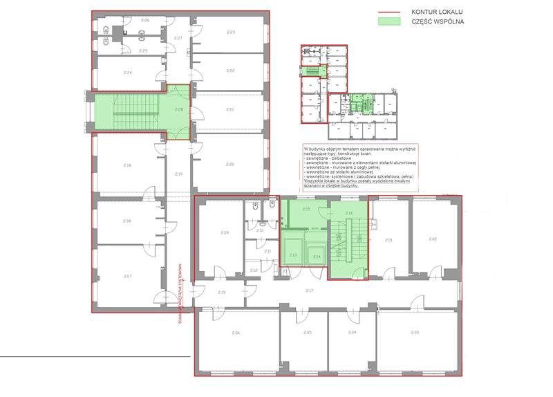 15 pomieszczeń biurowo-użytkowych (9,16–23,60 m2), w tym 10 pomieszczeń z pełnowymiarowymi oknami, 4 pomieszczenia z małymi oknami typu lufcik w górnej części ściany jedno pomieszczenie bez okien,