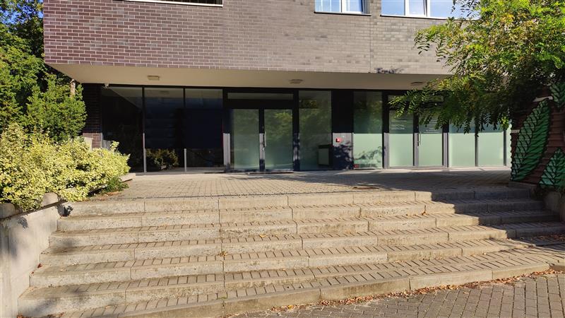 Wejście z poziomu "0" od jednej strony budynku. Od czoła budynku wejście po kilku schodach.