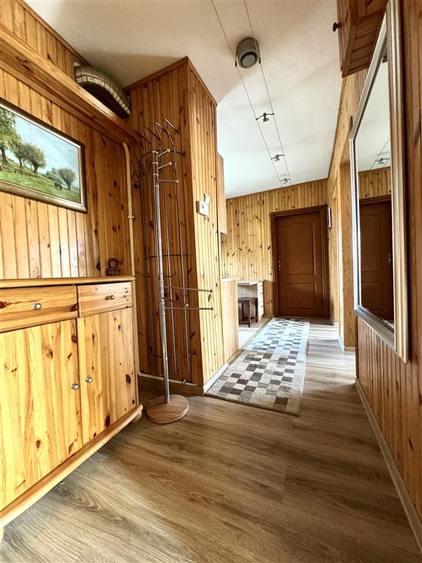 Okna PCV. W pokojach i w przedpokoju na podłogach panele, w salonie ściany malowane, w pokojach tapety, w przedpokoju boazeria.