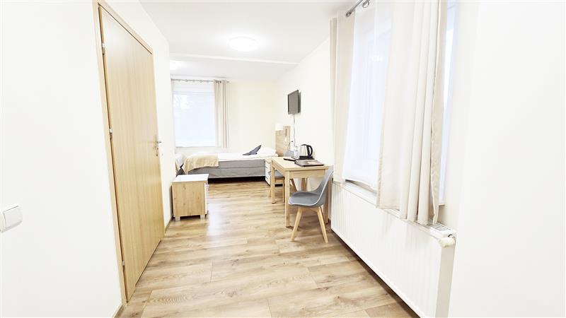 Bardzo ładnie doświetlony. W oknach żaluzje. Na wyposażeniu : czajnik elektryczny, stół, krzesła.