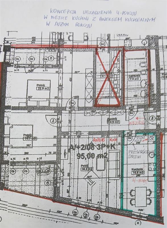 Przebudowa zakłada umieszczenie dodatkowego pokoju w aktualnej kuchni, zaś kuchnia znalazła by się jako aneks w obecnym salonie.