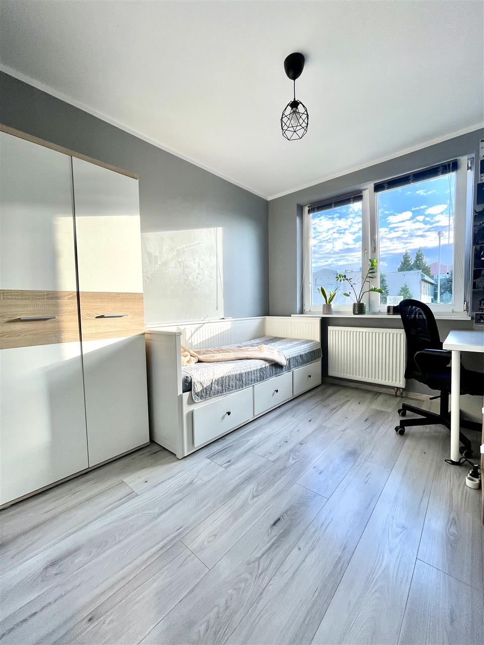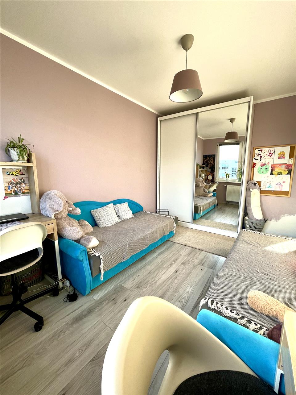 Mieszkanie znajduje się na pierwszym piętrze kameralnego budynku i zachwyca przemyślanym układem pomieszczeń, zapewniającym komfort oraz prywatność wszystkim domownikom.