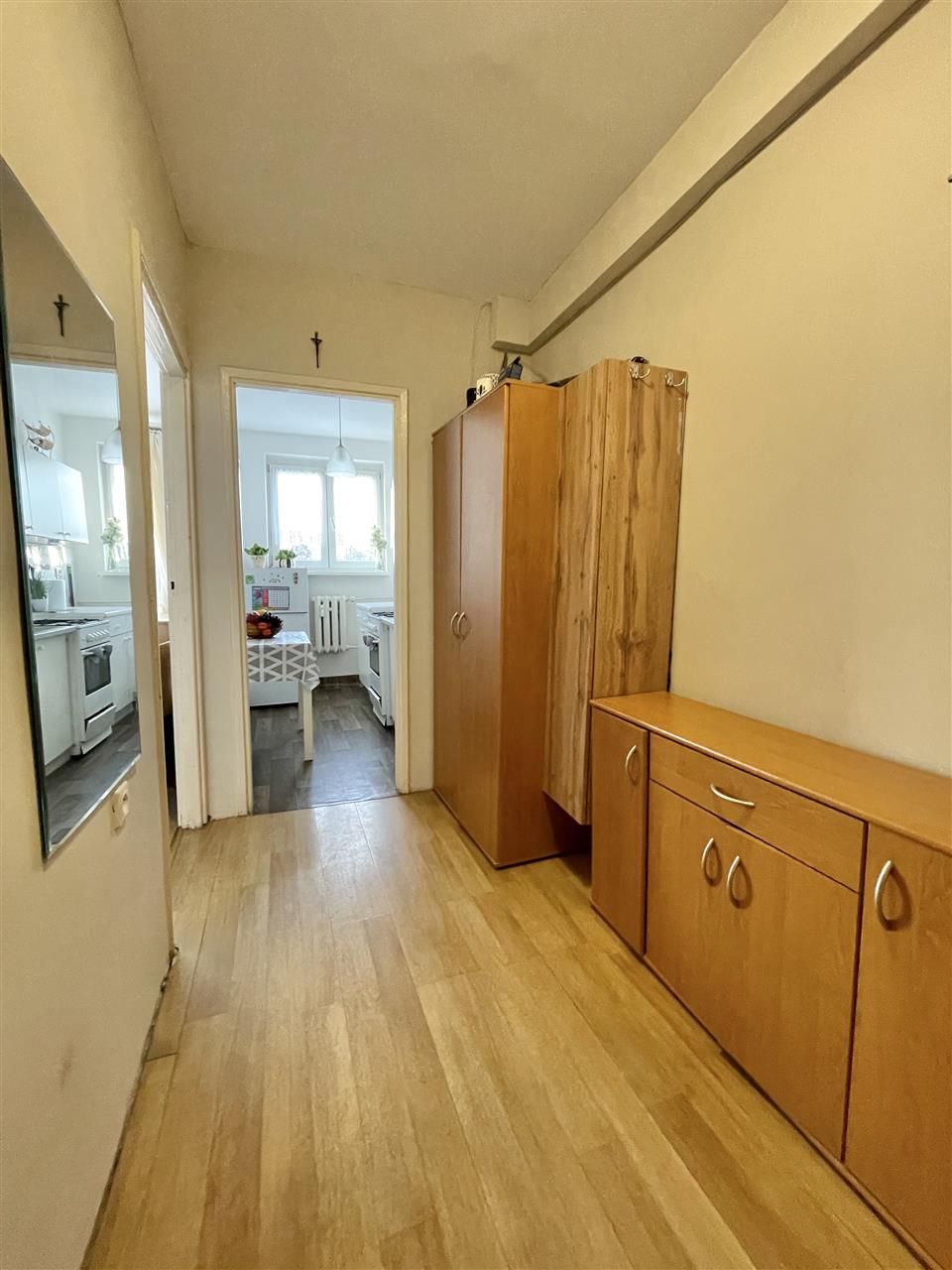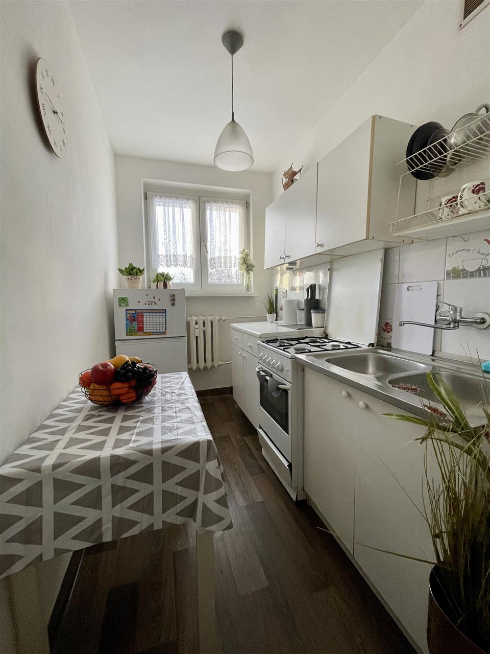Mieszkanie sprzedawane jest z pełnym wyposażeniem widocznym na zdjęciach, m.in lodówka z zamrażarką, kuchenka gazowa z piekarnikiem, pralka, telewizor, łóżko, komody i szafki.