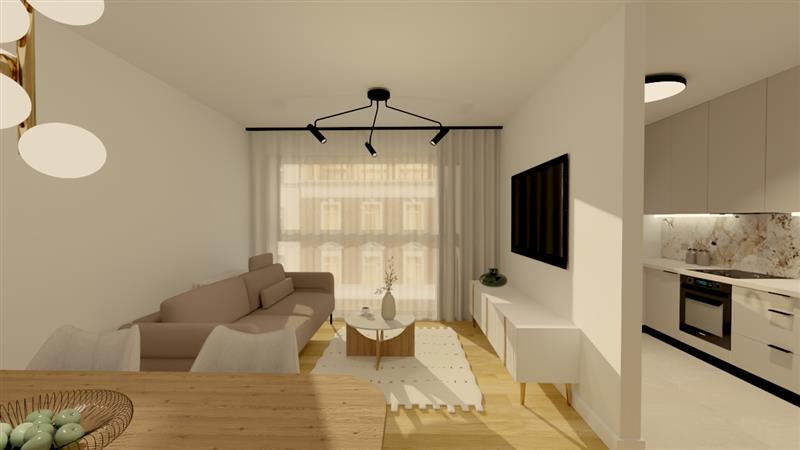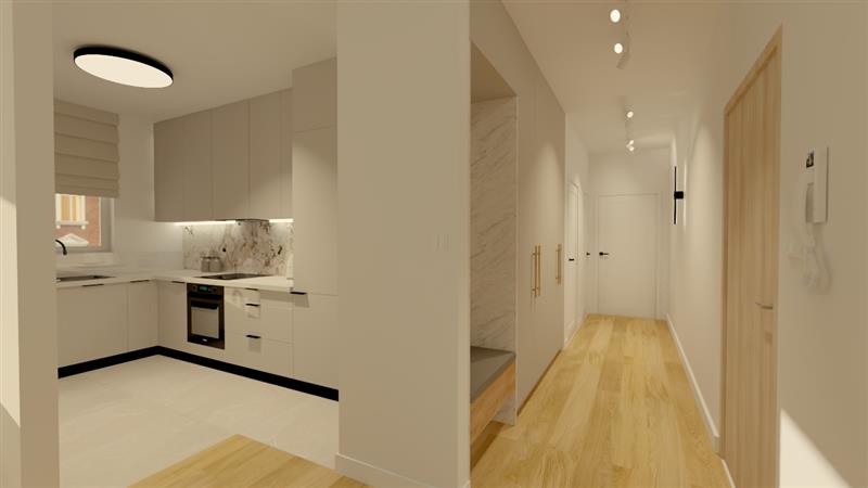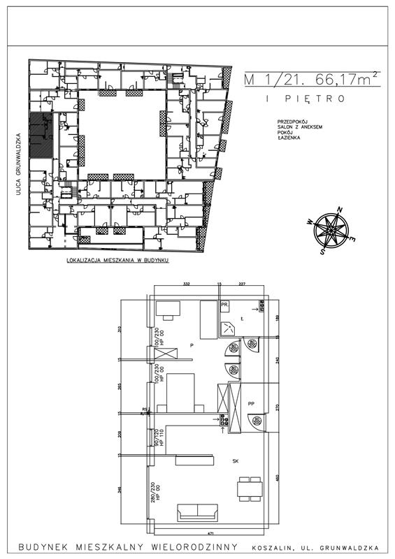 Prezentowane w ofercie mieszkanie o powierzchni 66,17m2, usytuowane jest na I piętrze, składa się z salonu z aneksem kuchennym, pokoju, łazienki oraz przedpokoju.