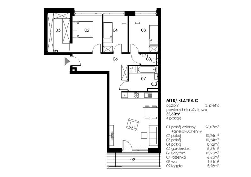 - W skład mieszkania wchodzą: salon z aneksem kuchennym, sypialnia x 3 , łazienka oraz przedpokój.