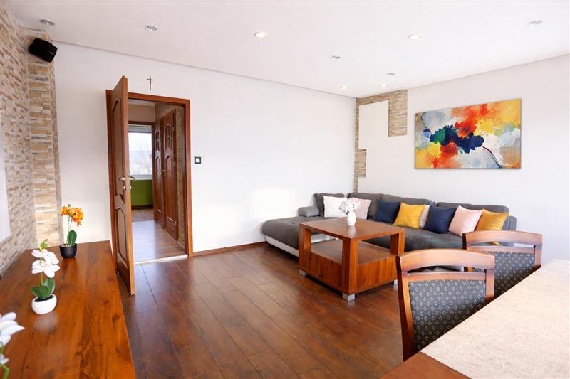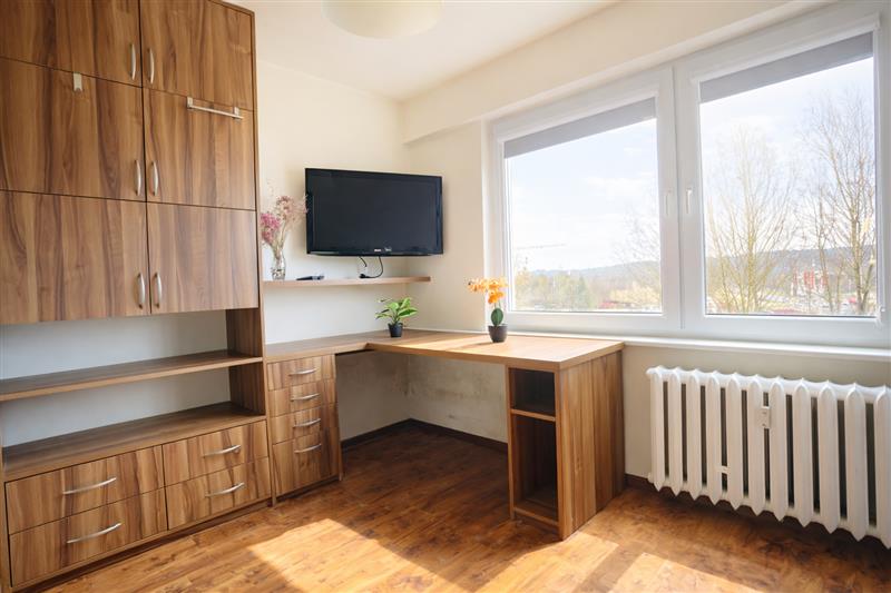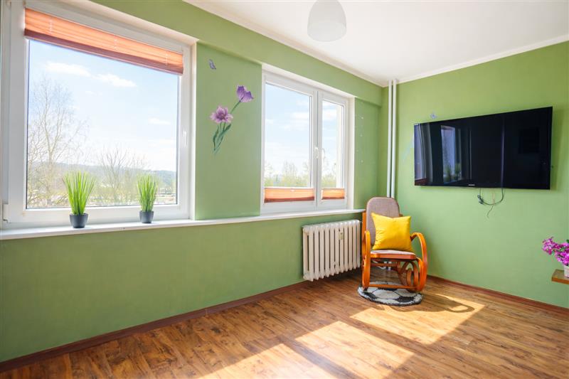 Mieszkanie składa się z przestronnego salonu, dwóch sypialni, kuchni oraz łazienki. Dużym atutem jest balkon, który stanowi idealne miejsce do relaksu. Z sypialni rozpościera się natomiast piękny widok na Górę Chełmską.