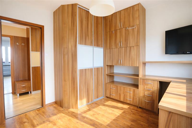 Salon został wyposażony w wygodną kanapę narożną, elegancki stolik kawowy oraz szafkę RTV, tworząc przytulną przestrzeń do wypoczynku. W jednej z sypialni znajduje się pojemna szafa w zabudowie, natomiast druga została urządzona jako pokój z zestawem mebli i biurkiem — idealny do pracy lub dla dziecka.
