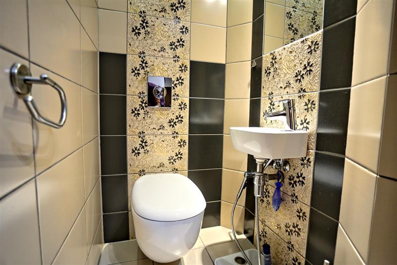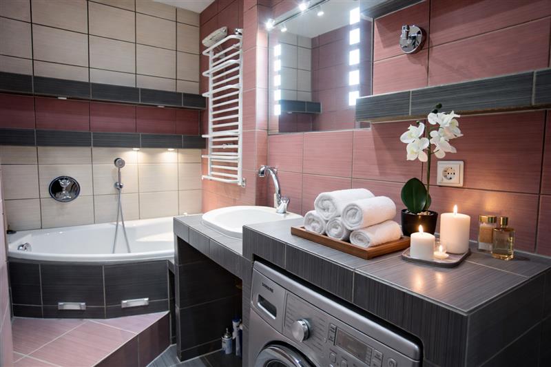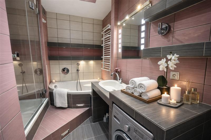 Niewątpliwym wyróżnikiem mieszkania jest łazienka — rzadko spotykana w tego typu budynkach, wyposażona zarówno w wannę, jak i prysznic. Dodatkowo znajduje się tu pralka, co zwiększa komfort użytkowania.