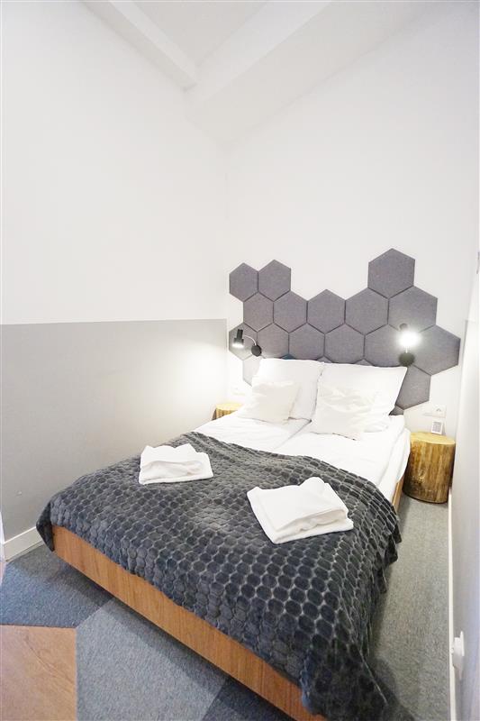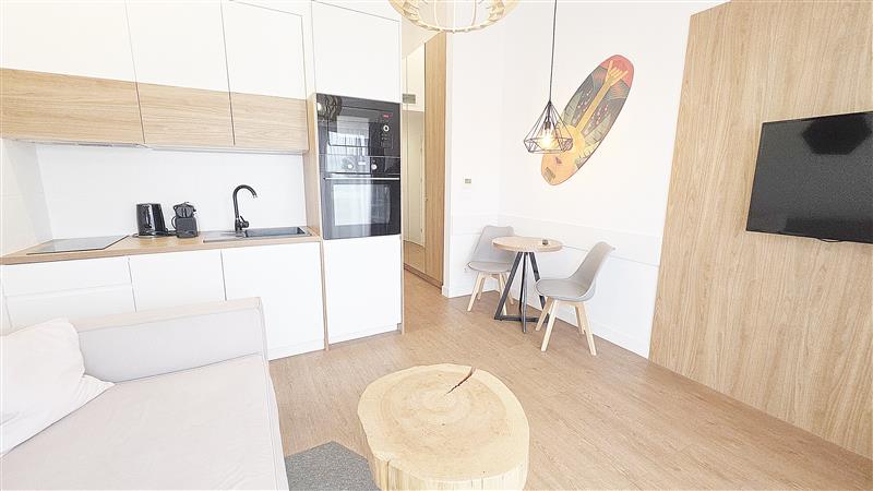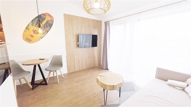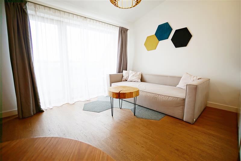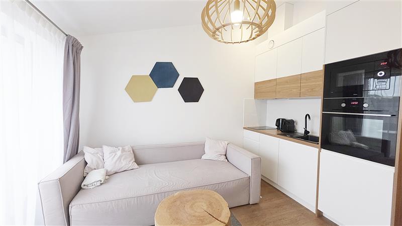 Mieszkanie składa się z salonu z funkcjonalnym aneksem kuchennym, w której znajduje się rozkładana sofa, posiada również osobną łazienkę z kabiną prysznicową, pralką, suszarką oraz przestronny korytarz z bardzo dużą szafą w zabudowie. Mieszkanie jest kompletnie wyposażone, gotowe do wynajęcia lub do własnego użytku. Kuchnia wyposażona w akcesoria kuchenne, zmywarkę, piekarnik, mikrofalówkę. W apartamencie można korzystać z bezpłatnego internetu Wi-fi, który zapewnia kompleks.