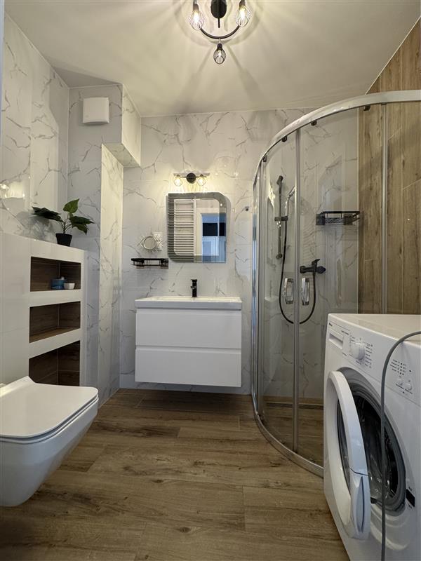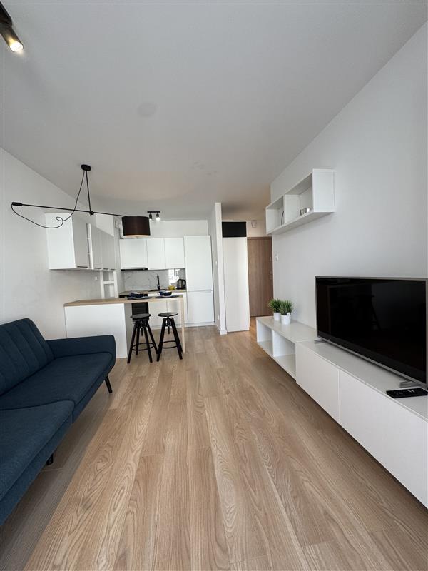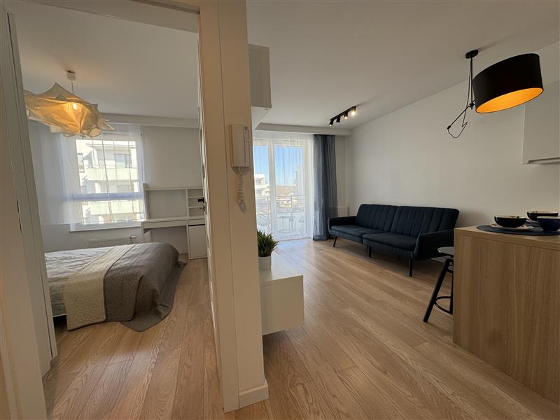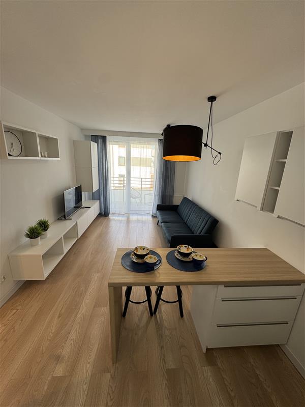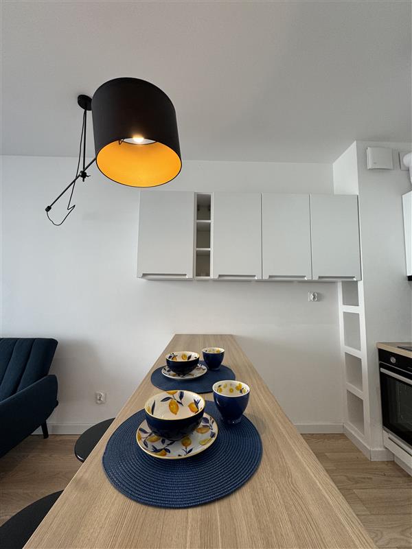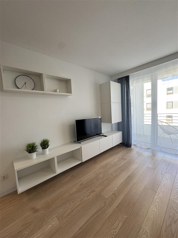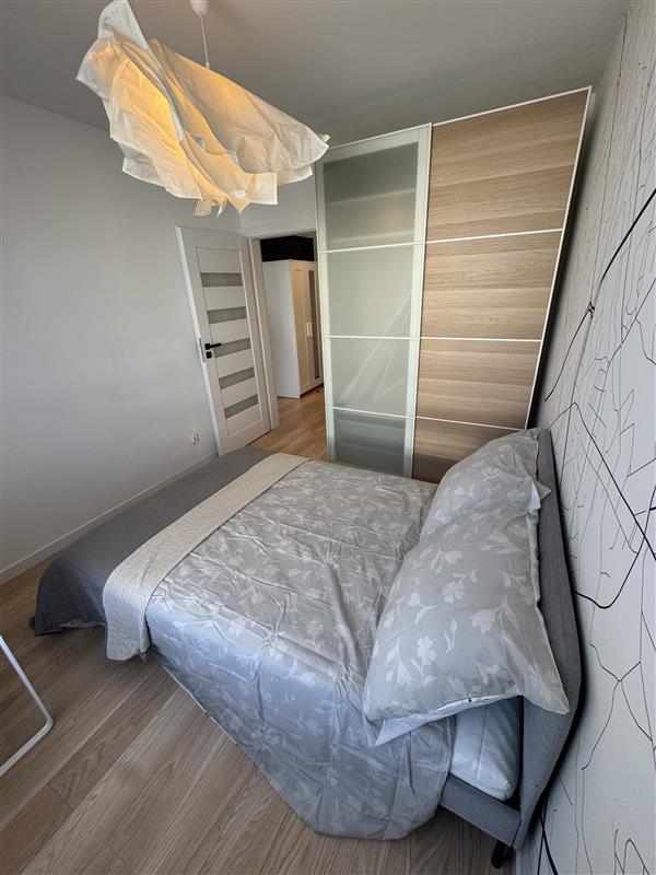 Mieszkanie wyposażone jest we wszystkie meble i sprzęty niezbędne do funkcjonowania: zmywarka, pralka, piekarnik, szafy w korytarzu i sypialni, sofa rozkładana w salonie.
